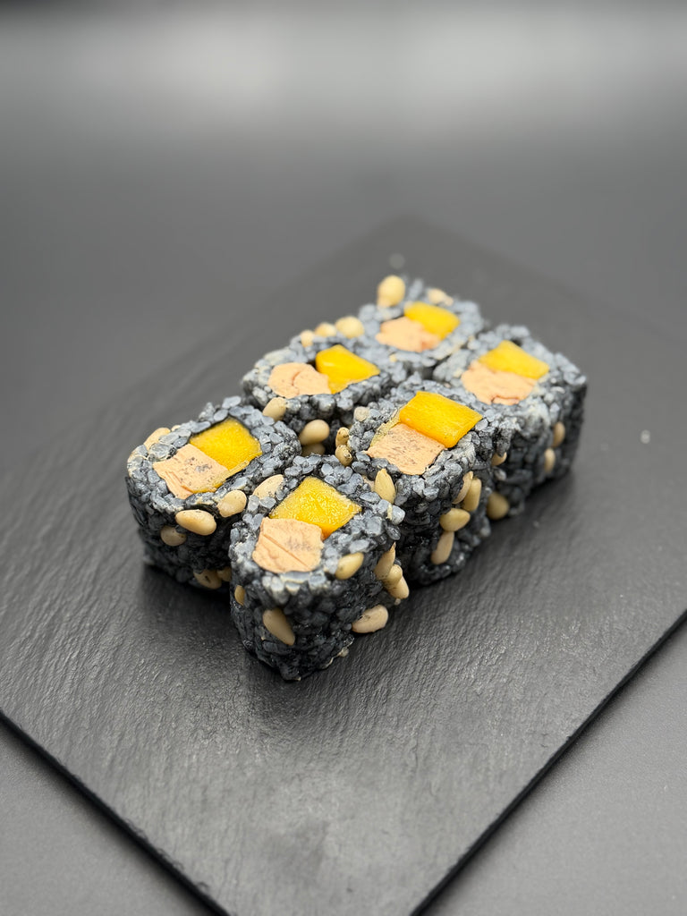 Sur base de riz vinaigré noir et pignon de pin. Laissez vous tenté par le sucré de la Mangue avec son coulis de figue, et le salé du foie gras.