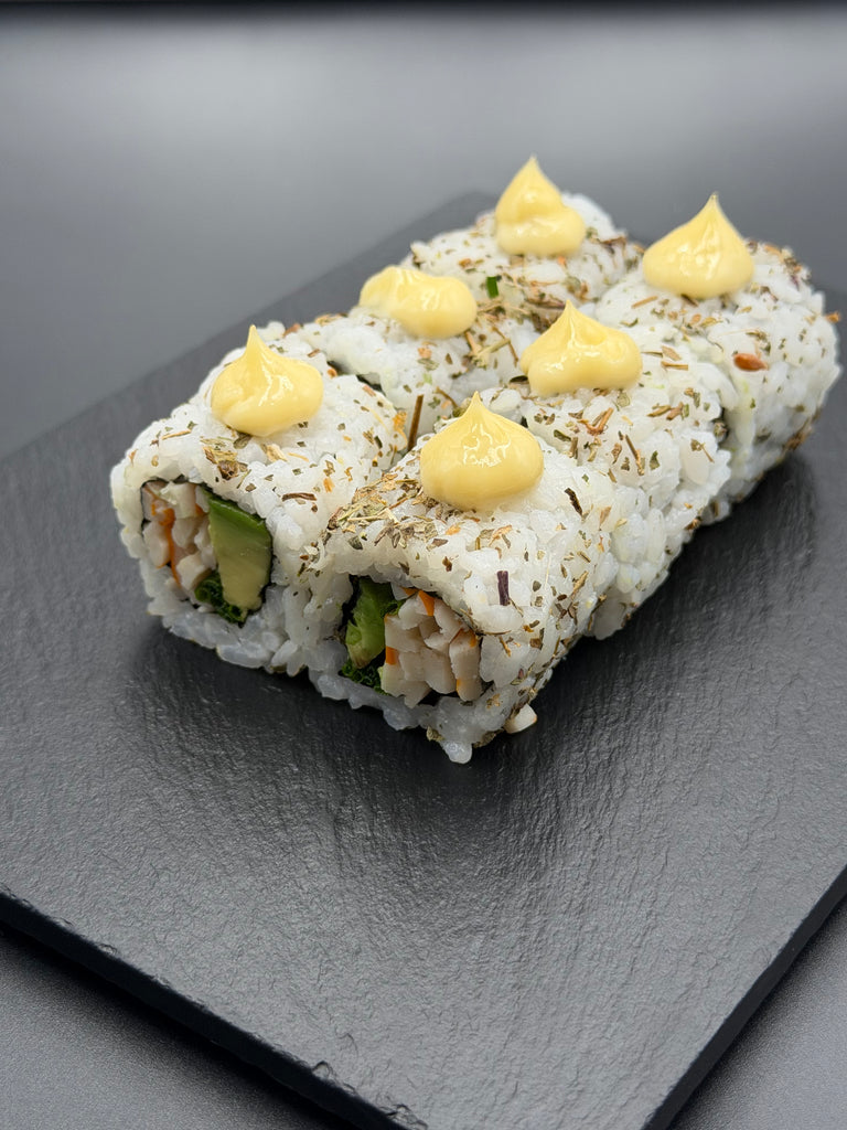 Sur base de riz vinaigré, émietté de crabe, avocats. Coté finition, basilic séchée, mayonnaise japonaise.