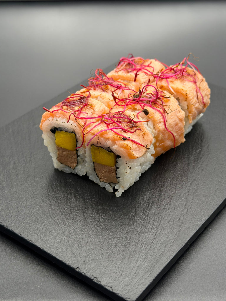 Sur base de riz vinaigré, mousse de canard au porto, mangue. Le tout recouvert de saumon mariné snaké. En finition, point de confiture de figues, jeune pousse de betterave et pralin.