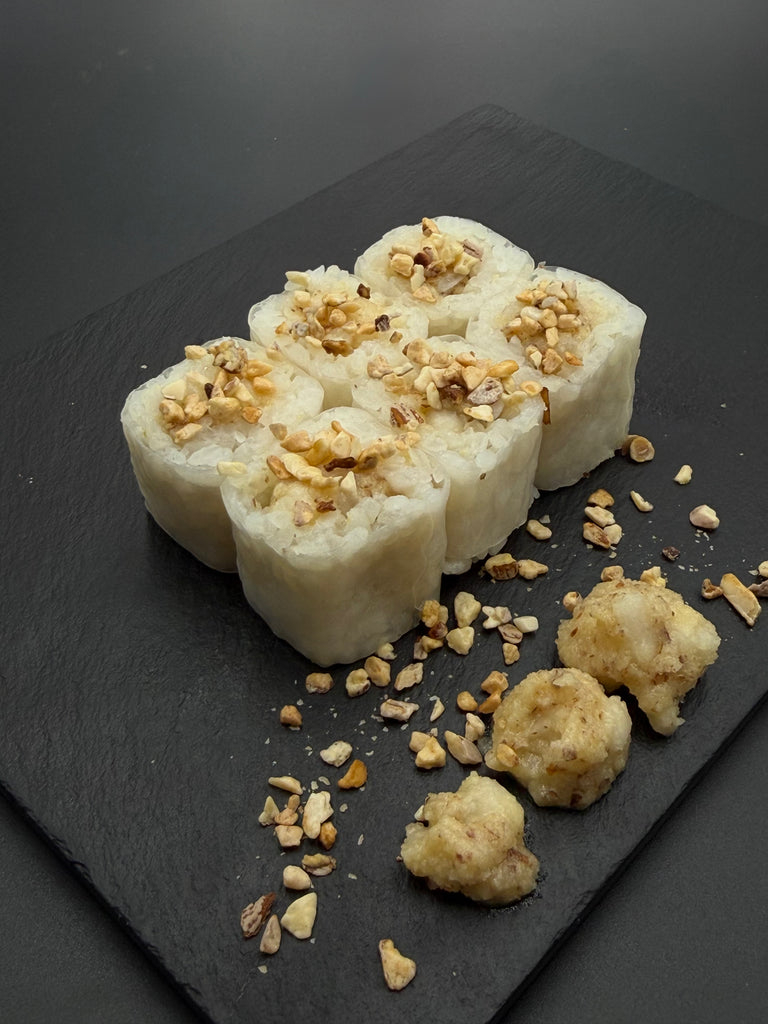 Un maki à la crème d'amande, sublimé par des cubes de poire fondants et délicatement parsemé d'amandes caramélisées, pour un équilibre parfait entre douceur, finesse et croquant.